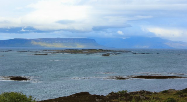 Sunlight slips through holes in the clouds and throws patches of light on the islands across the water. What a view!