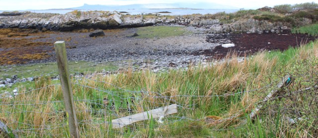 Although I’m following what appears to be an obvious path, I soon find my way blocked by a fence. I follow the fence down to the shore, expecting to find a stile. Instead, I find a spot where other walkers (I assume) have trampled down the wire…
