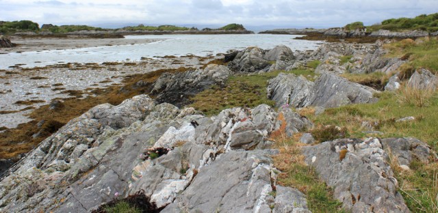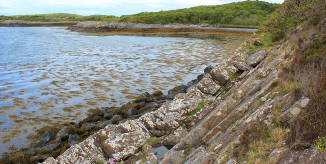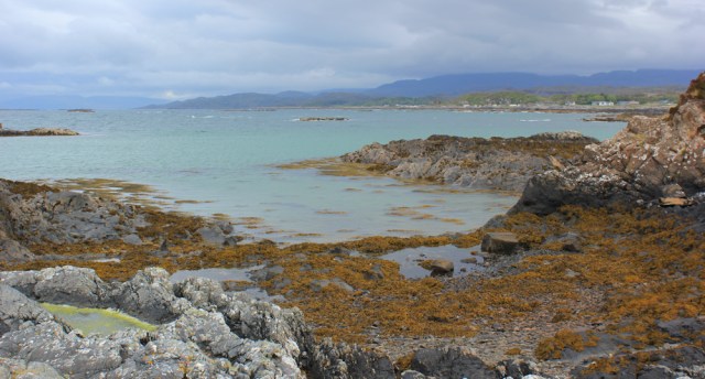 … so I climb over the remaining barrier and walk along the shore. It’s an irregular coastline, with a series of tiny bays separated by stretches of sharp rocks. Golden seaweed coats the stones on the beach, providing a slippery surface. I have to concentrate on keeping my footing as I make my way forward.