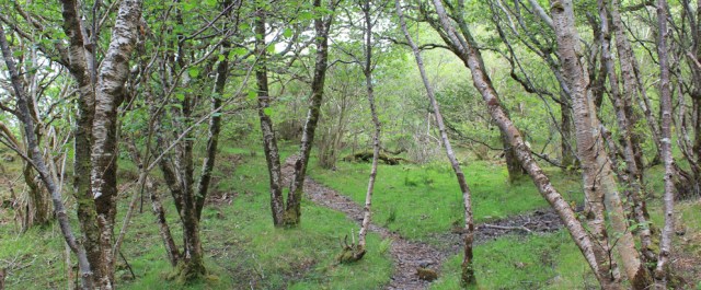 There’s no sign of a path, but I push my way through scratchy bushes and reach the woodland, where the ground underfoot is clearer and a path magically appears. It turns out to be a confusing route among the trees, as there are numerous forks in the path and many choices to make.