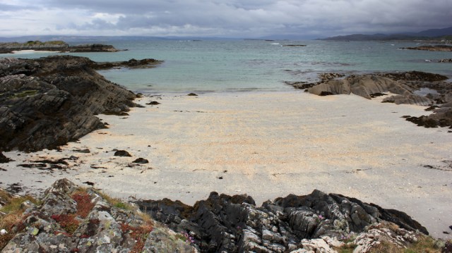 Finally, I reach another ridge of rocks, and am forced inland to follow another cow path through trees and bushes, emerging on the edge of a beautiful bay filled with pale sand.