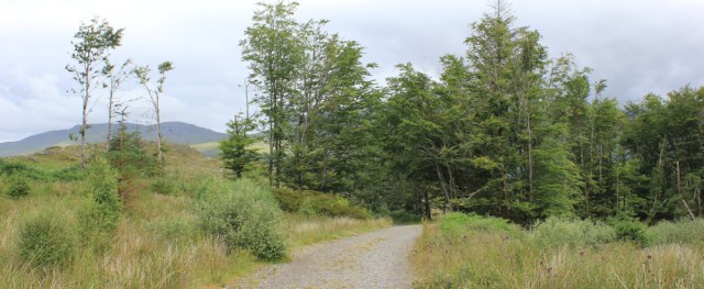 … past a small quarry and then into a logged area, where my track joins a rough forestry track. I turn left along the track. A sign warns of dangers, but there is no evidence of any recent tree felling. The old stumps are overgrown with bracken.