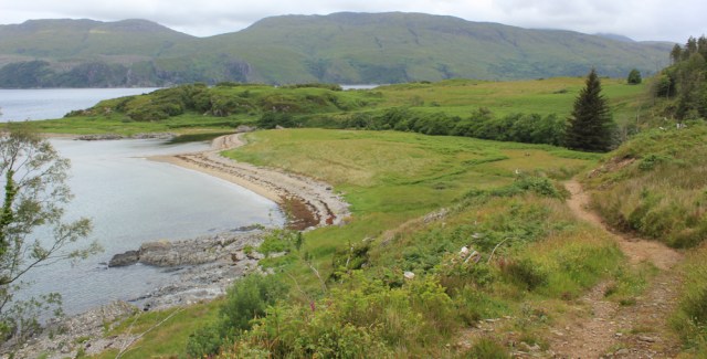 I reach a wide turning place, where the track ends and a narrower path begins. It slopes downwards, and I soon see a bright, flat area ahead, along with a curving beach and a surrounding hedge of fir trees. That must be Sandaig.