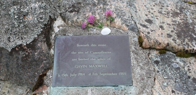 This is the memorial to Gavin Maxwell, and a plaque tells me his ashes are buried here. There are some dead flowers lying at the foot of rock, and I replace them with a few wild flowers I find close by.