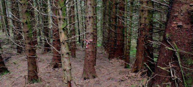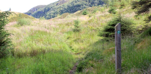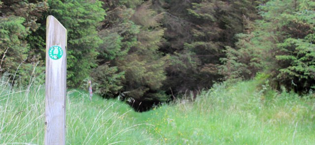 I reach the edge of the grassy plateau. A marker post tells me this is definitely the Lochalsh Trail, and I should find the little green circle reassuring. But there is something horribly menacing about the line of trees ahead. It’s a pine plantation – the sort of forest I really dislike.