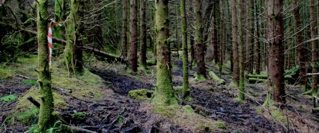 As well as being gloomy, it is also very, very muddy in here. The path disappears under a mess of dark slurry. I slip and slide, grabbing onto trees trunks to try to stay upright, grateful for the red and white tapes showing me the way.
