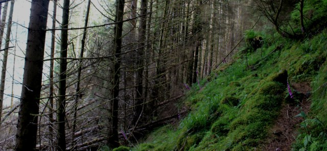 Every step is an effort. In between stretches of obvious mud, layers of pine needles hide the slippery surface. I climb up among the trees, trying to find a safe route through, but the forest seems to hate me. Roots and fallen branches constantly try to trip me up, and the tree trunks reach out long fingers to snag my coat.