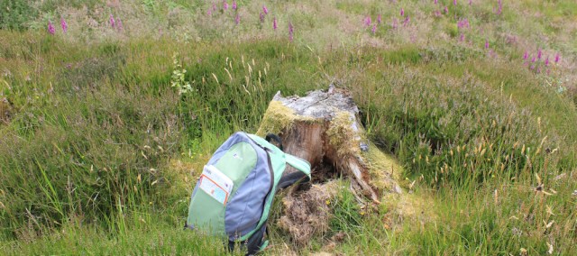 I’m hungry now, so when I spot a tree trunk on a little hillock I leave the path and climb up a short slope to reach it. It’s a perfect picnic spot.