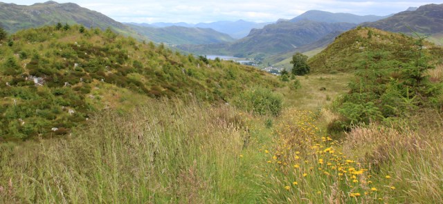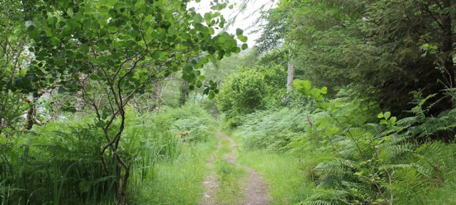 After Totaig, the track dwindles to a path and begins to climb up the hill through bushes and trees. I overtake a group of women strolling with their dogs, and plod on upwards.
