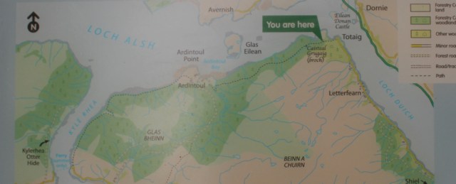 This morning is bright and sunny, and I’m very optimistic as I cycle from Shiel Bridge along the edge of Loch Duich. Today I plan to complete the walk I failed to complete yesterday. Yes, today I’m determined to find the elusive path from Ardintoul along the Lochalsh Trail, and I’m going to find it by walking through from Totaig.