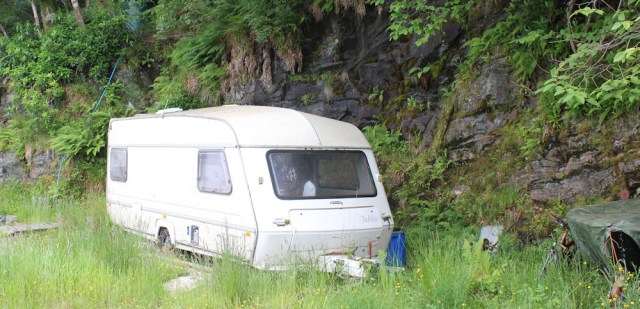 Nearby is a caravan. Perhaps the owner/renovator might be living here while he works on the cottage?