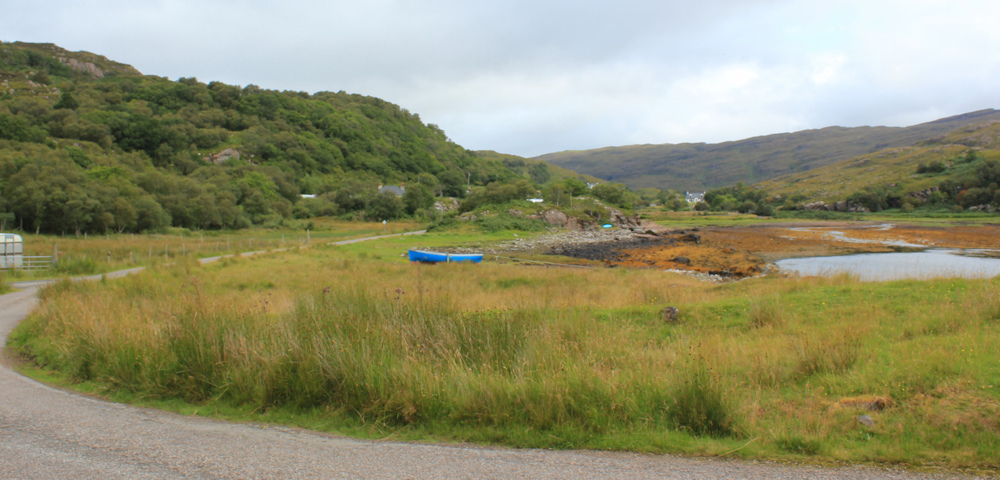I turn my back on the pier, and head up the road, which curves around the muddy shore at the top of Loch Toscaig.