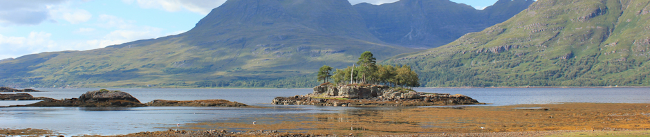 I look inland. Rough grassland is fringed with trees and, behind the trees, the ground rises steeply. I know the road runs across the slopes above, and I can hear the occasional, faint noise of traffic. Beyond the road, the peak of Ben Shieldaig is an unmissable and observing presence.