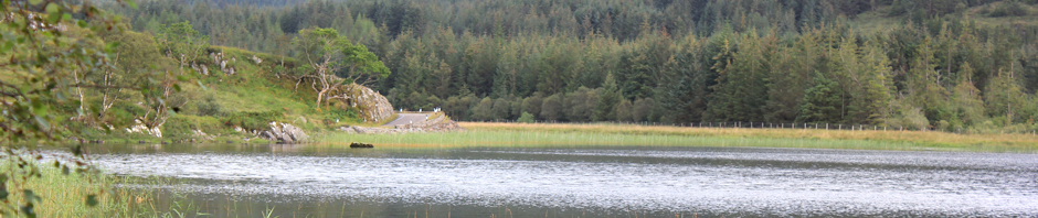 I’ve left Loch Arienas behind, and the road soon swings round a tight corner, so I am now walking along the edge of another loch. Loch Doire nam Mart. Its pale water is overshadowed by hills covered in pine trees.