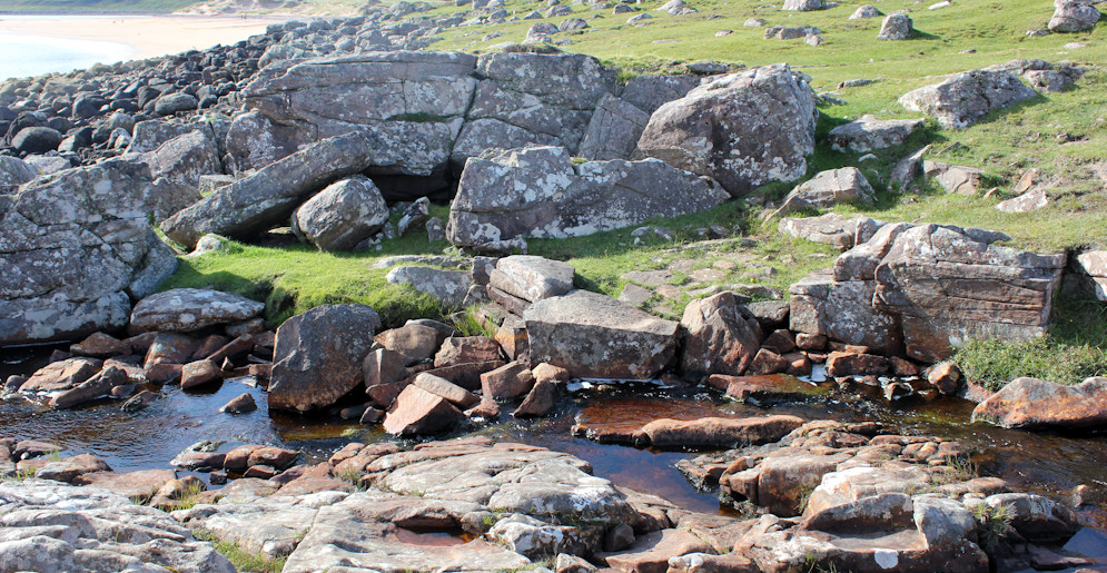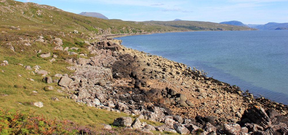 As the path drops lower, I come down to the shore, and pick my way between the rocks that lie tumbled over the foreshore.