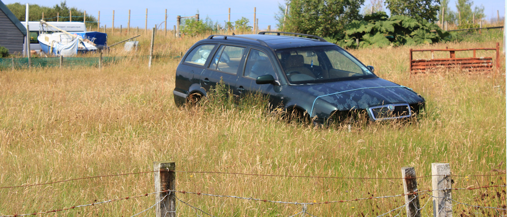 I pass a ruined building, and a few scattered cottages. An abandoned car stands forlornly in a meadow, no longer moving, but acting as some sort of storage shed.