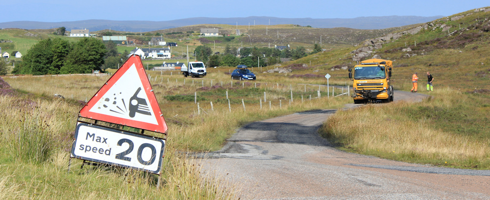 I’ve nearly reached the bottom of the hill, where the cottages are grouped closer together, to form a village called South Erradale. There are road works going on.