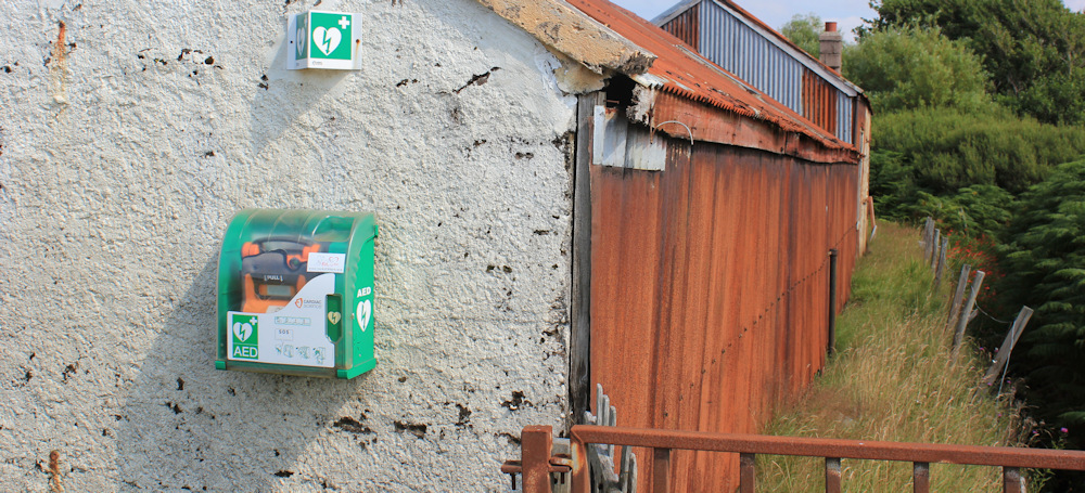 Just before I reach my car, I pass a green box attached to the wall of a shed. A public defibrillator.
