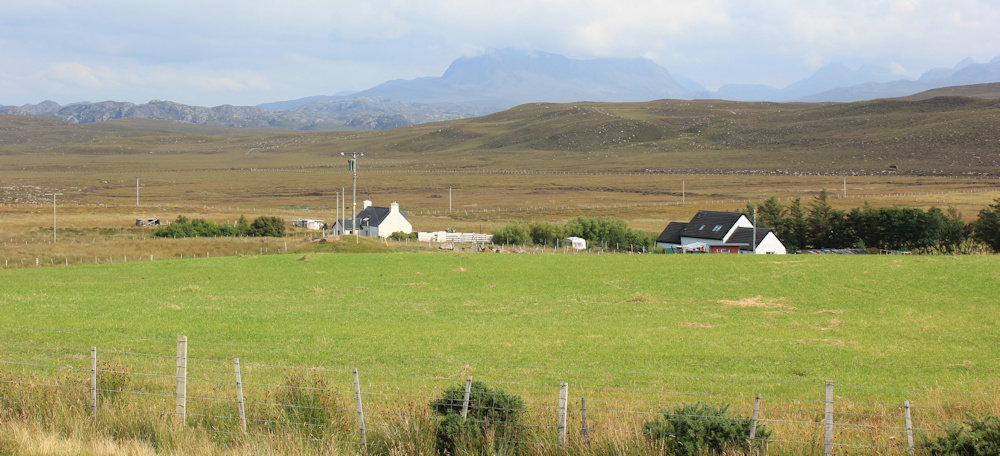 The view inland is quite beautiful. This is flattish, grazing land, with the mountains of the Torridon range forming a dramatic backdrop to the green fields and white cottages.