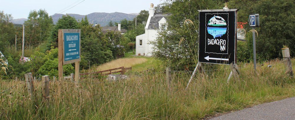 I’ve reached Badachro. Neat cottages, and a splendid sign for the Badachro Inn. You can only just make out the parking sign [P], which is hidden from view by the pub sign. That explains why I took so long to find the car park earlier.
