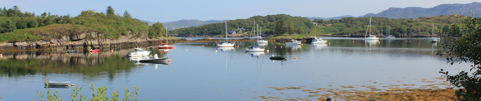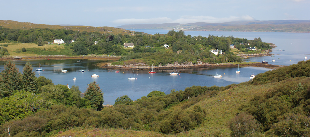 I sit on a dry rock, have a snack and a drink, and think what to do next, while I admire the view. That’s Badachro below. What a perfect little harbour.