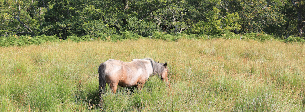In a meadow, a horse munches away in the long grass. Raises its head to watch me, but decides I have nothing to offer, and continues feeding.