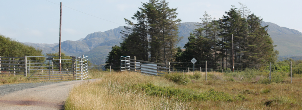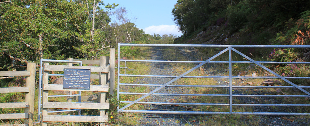 Beyond the loch, I cross a cattle grid and go through a gate. Another sign (lots of signs round here!) asks me to “Please close the gate. We have planted a natural woodland, which will take 10 years to establish.” The grid and the gate is to keep out deer.