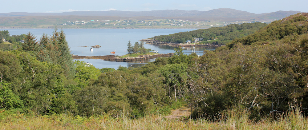 So, I head off the track, and climb a steep bank, forcing my way between trees and through bushes, and stumbling over clumps of coarse grass, until I emerge into the open. The view below is stunning. Loch Gairloch.