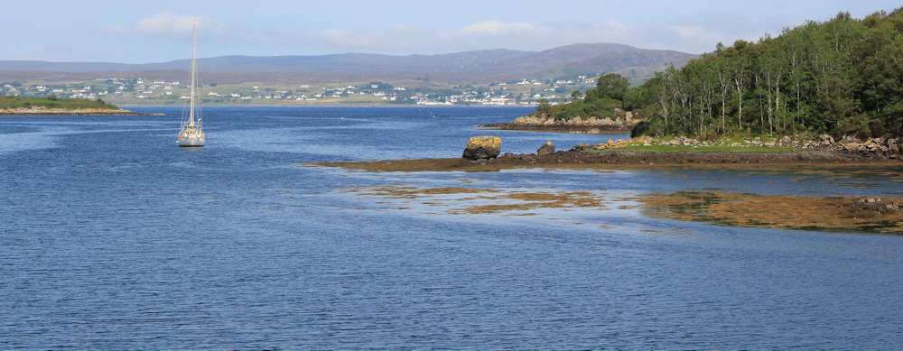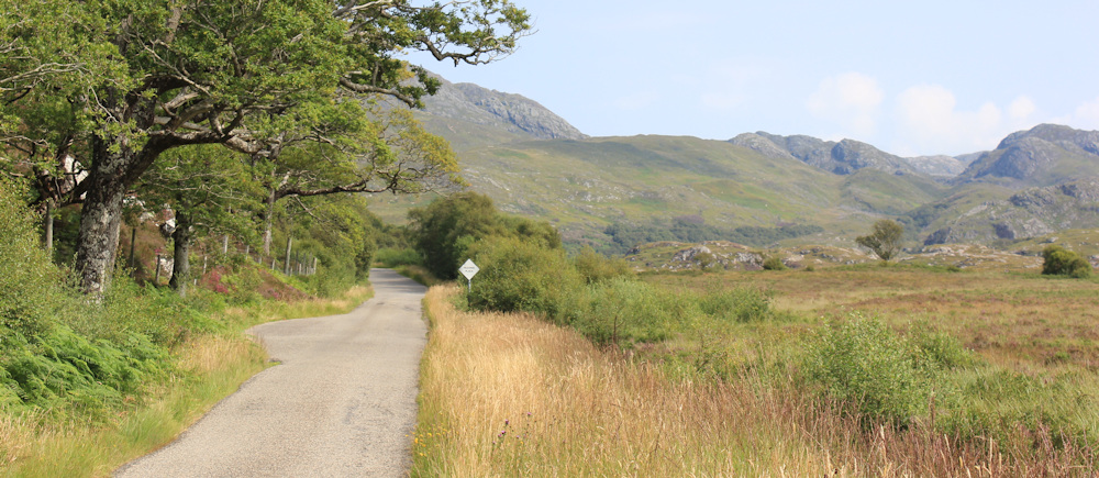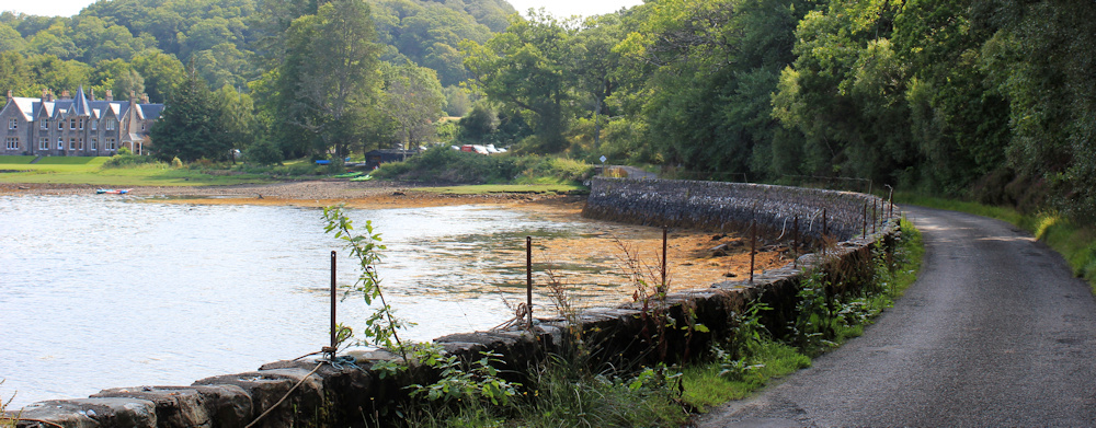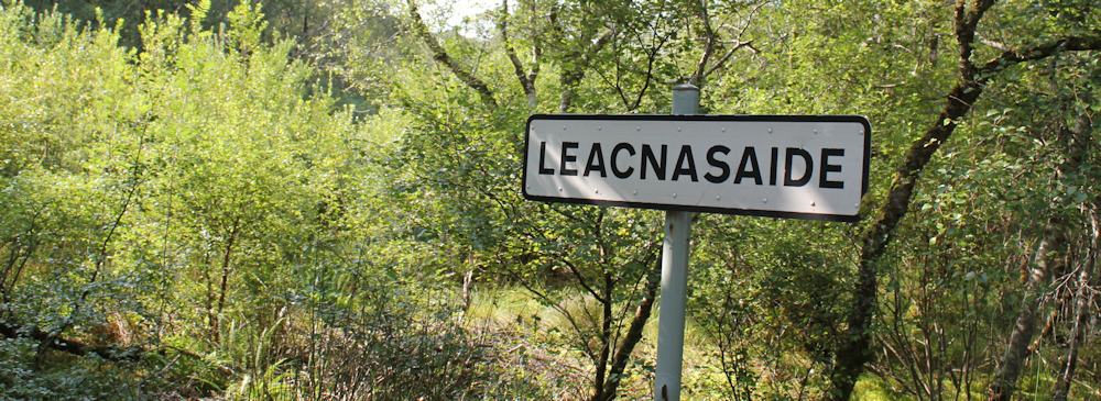 Onwards, along the road. It’s running closer to the shore now, and I see glimpses of water through the trees. A sign tells me I’ve reached Leacnasaide, which is just a small collection of houses.