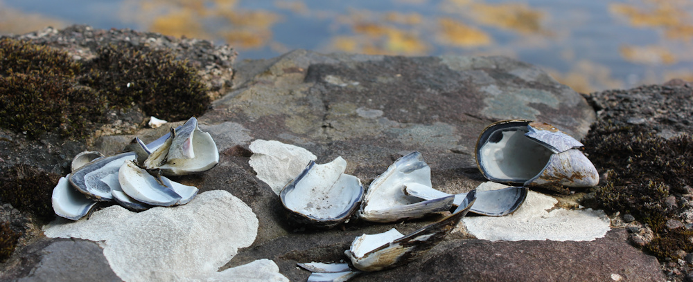 On the wall are remnants of shells. All smashed open and in pieces. A sea bird must have eaten its dinner here.