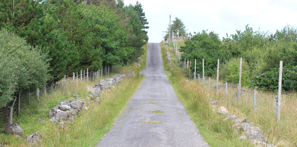 This road, to the right, will take me up the other side of the valley and out of North Erradale. Unfortunately, it’s uphill all of the way, towards a lumbering mass called – I check my map – Meall Glac na Daraich