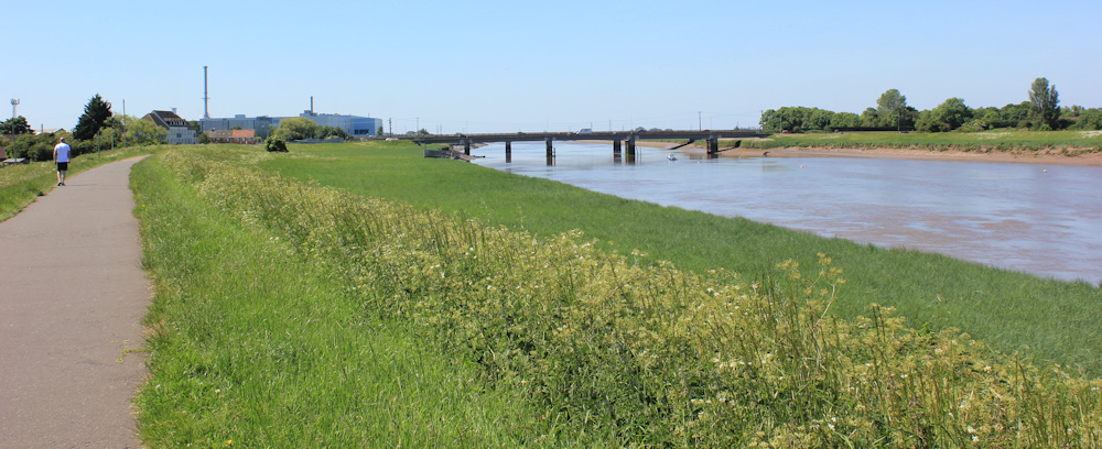 After leaving the marshy area, a tarmac footpath/cycleway runs along the bank of the river, towards the nearest bridge. It looks like a newly created route – long, straight, and rather boring, to be honest. A signpost tells me this is part of the the “Fen Rivers Way”.
