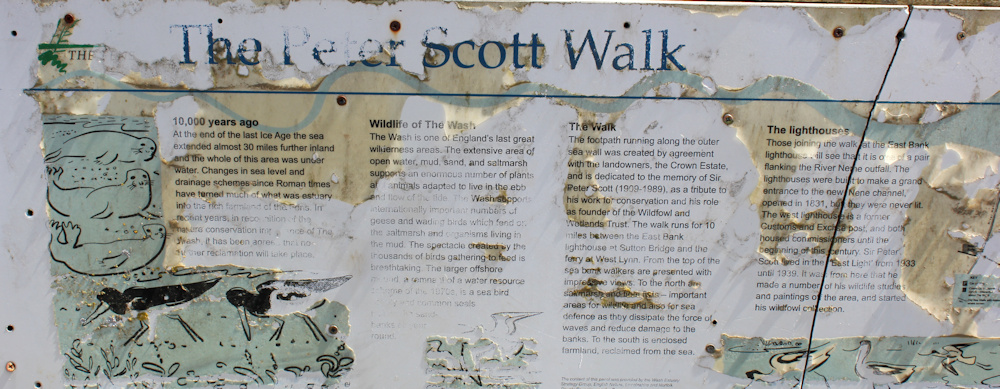 At this point, I must leave the river wall. I walk through the ferry car park, saying “hello” to my Scooty bike in passing, and then out onto a road into West Lynn. A faded sign tells me this is the start of The Peter Scott Walk. It’s hard to read, but if I follow the walk for long enough I should reach Peter Scott’s lighthouse.