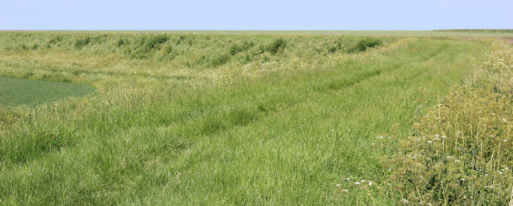 I struggle back to the bank, and continue to force my way through shoulder-high grass and nettles, until I reach the end of the hedge. It’s a relief to climb back up the bank and to be walking along the proper route on a flat surface with short grass.