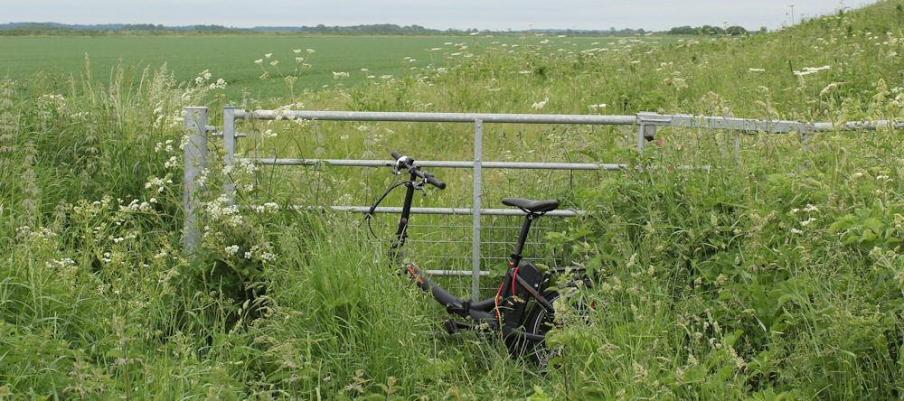 I cycle on the backroads from Sutton Bridge to the end of the road at Ongar Hill, and leave my Scooty bike chained to a gate.