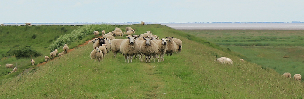 Or maybe he’s checking on his sheep? They’re spread all over the marsh, and a posse are guarding the sea wall. They seem reluctant to move…