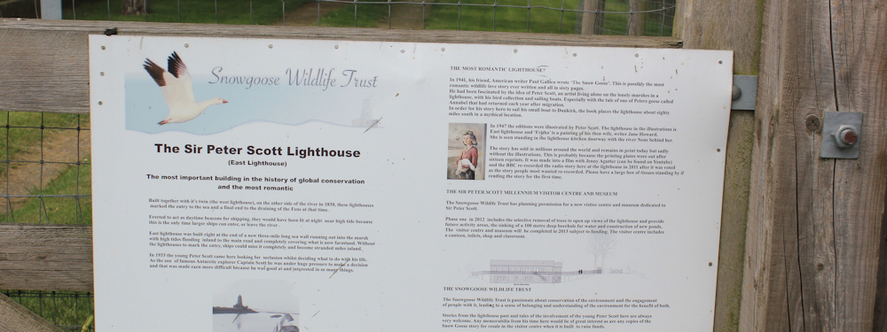 Although the name of Sir Peter Scott is familiar to me as a famous ornithologist, I didn’t know he lived in a lighthouse, or anything much else about him. I stop to read the information board.