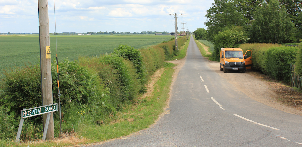 A few little roads lead off to my left. One of these has a name which catches my eye. “Hospital Road.” Hospital? Out here. Really?