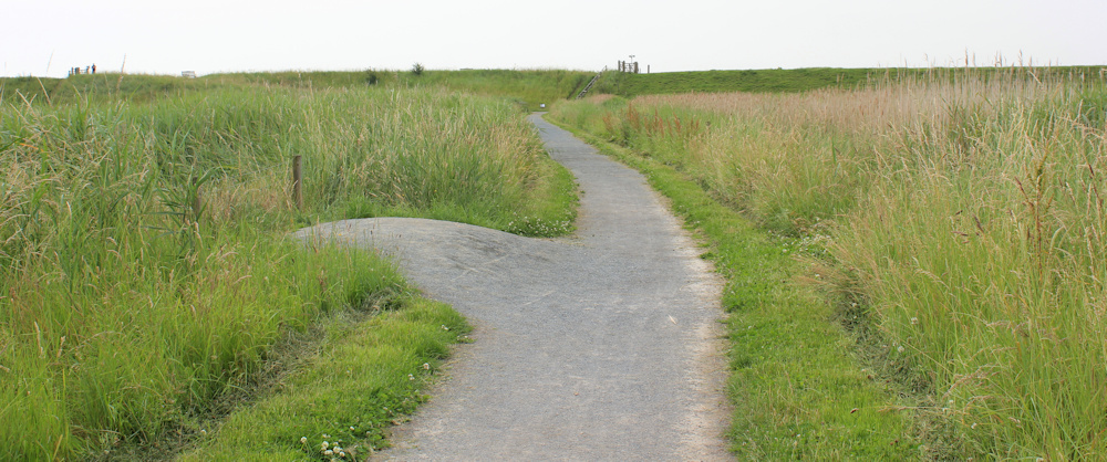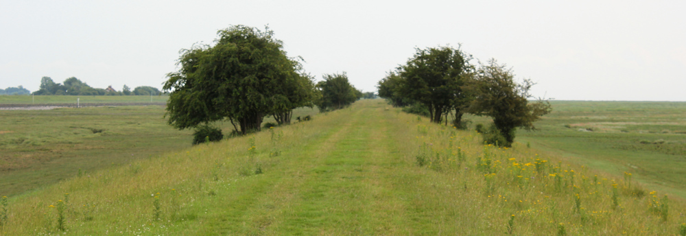 … and set off down the footpath towards the sea bank. There are several raised areas to the side of the path – like mini passing-spots if this was a proper road – which seems a bit odd, until I realise they are designed so that wheelchair users can watch the birds on the marsh.