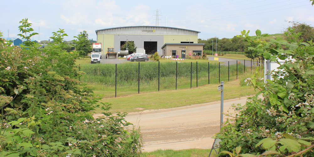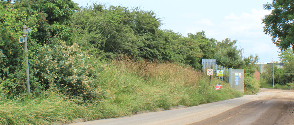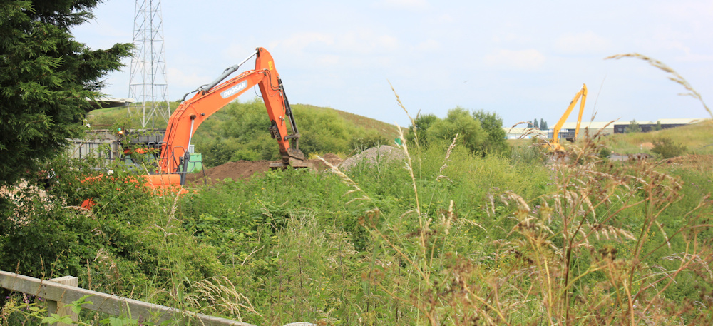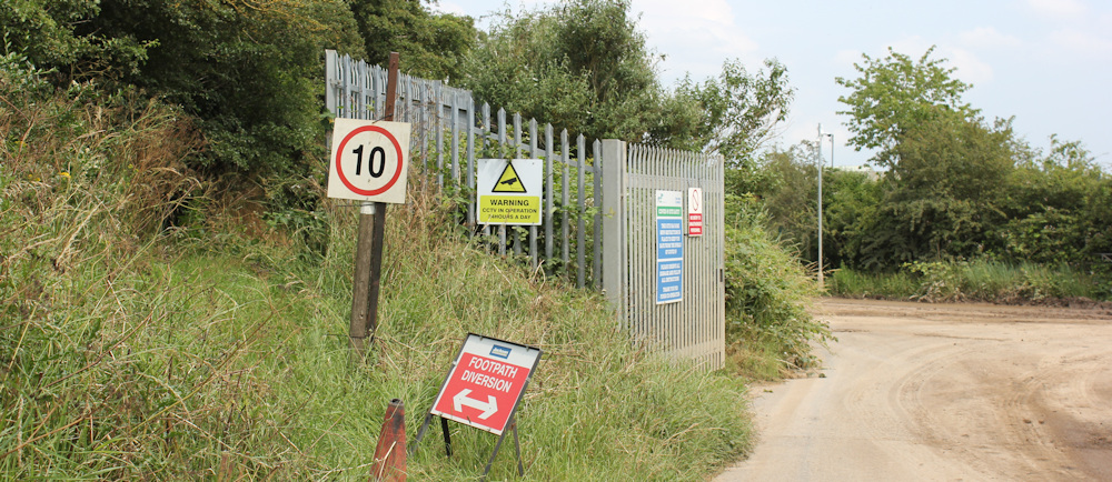 It’s pretty overgrown, but at least it’s passable. The footpath runs on an uneven slope above a track. I pass a car park, and the entrance (I think) to the old landfill site, where I can see diggers in the distance. Are they expanding the landfill area? I can’t tell.