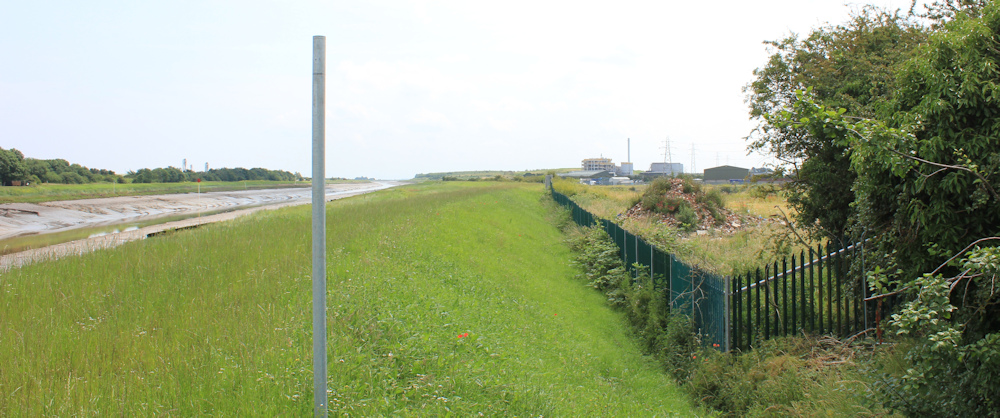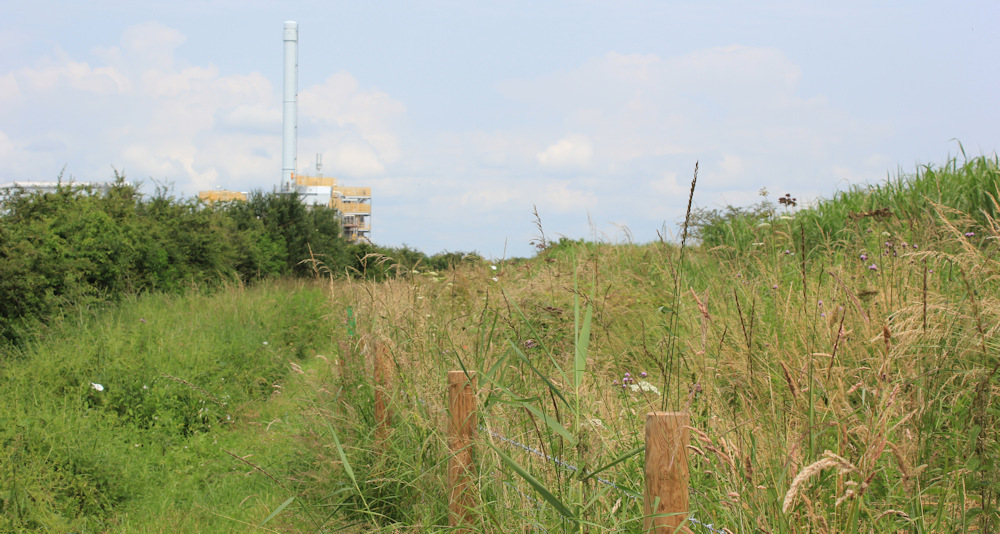 Onwards. The track comes to an end, and now I’m following the line of a barbed wire fence. Industrial complexes – including one with a very tall chimney – poke above the bushes to my left.