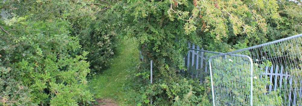 The path is contained within an overgrown hedge and a barbed wire fence. Beyond the fence, across a strip of vegetation, I can see piled up earth. Is that the reason for the footpath diversion?