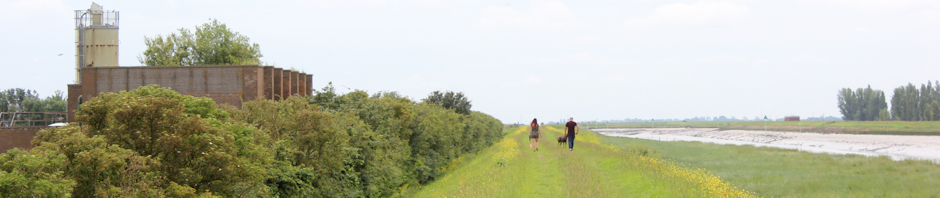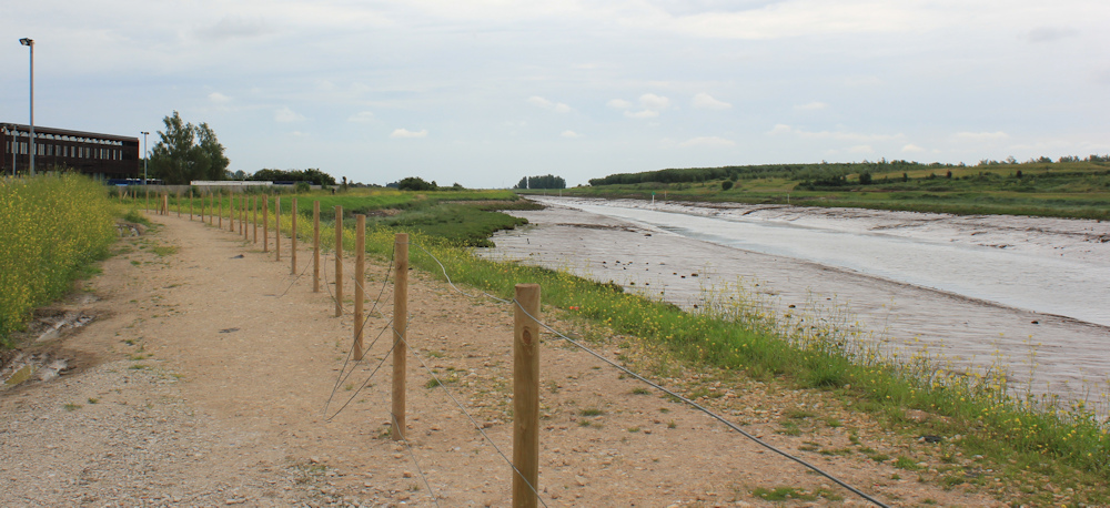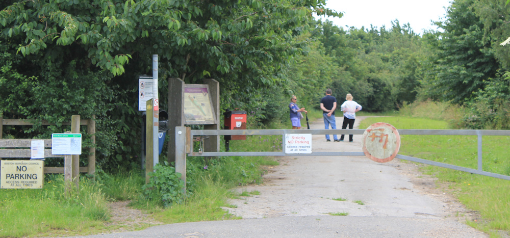 After a short distance, the footpath takes me down onto a roadway, which leads past various industrial yards and storage facilities, until I end up in a small car park. This seems to be a narrow strip of public access land and popular with dog walkers.