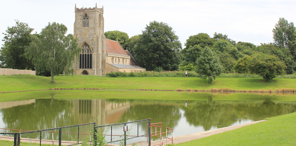 There’s a roadway along the top of the bank. I pass a large pond with square corners – not a natural pool. On the other side is a Norman Church. A very pretty scene.