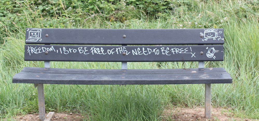 I pass a seat, where someone has scrawled, “Freedom is to be free of the need to be free.” Wise words.