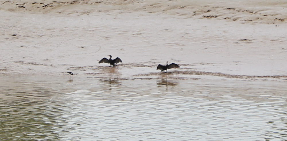 On the far side of the river, two familiar birds are standing in the mud. Comorants. I put my camera on full zoom and catch a fuzzy shot of them posing with their wings outstretched.