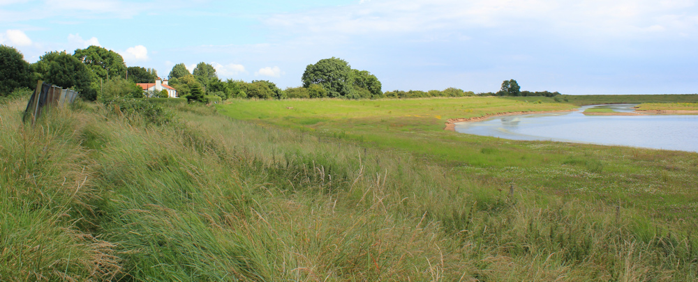 The proper path curves around on a raised bank that encloses the inner side of an elongated, rectangular area of marsh. I draw level with the point where, on the far side, the sea wall has been breached. You can see the definite gap.
