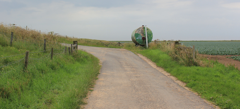 After three miles, I finally reach the point where the track curves round and rises over the bank. The bend is marked by a cylindrical green tank – a water bowser, I think.