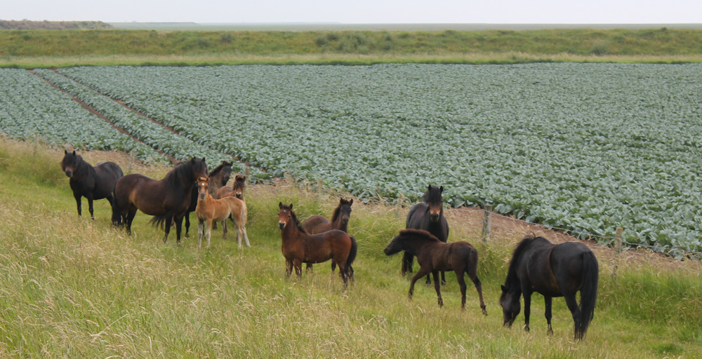 The grass over here looks well-cropped. I worry about meeting cows, but instead I meet a group of horses. Oh, how lovely. And with young foals too.