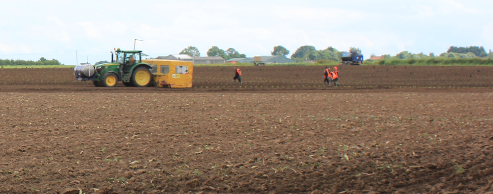 This field is being picked. I’m always amazed at the ingenuity of farm machinery. Here a special conveyer belt holds a chain of yellow cups, into which the cabbages are placed before being transported into the covered trailer at the rear. Somebody has to pick the cabbages, of course. And here they come.